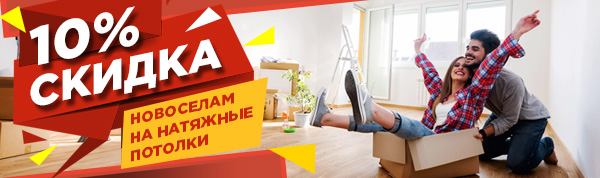 При заказе натяжного потолка скидка 10% новосёлам. Скидки и акции не суммируются. Подробнее об акции уточняйте у наших менеджеров.